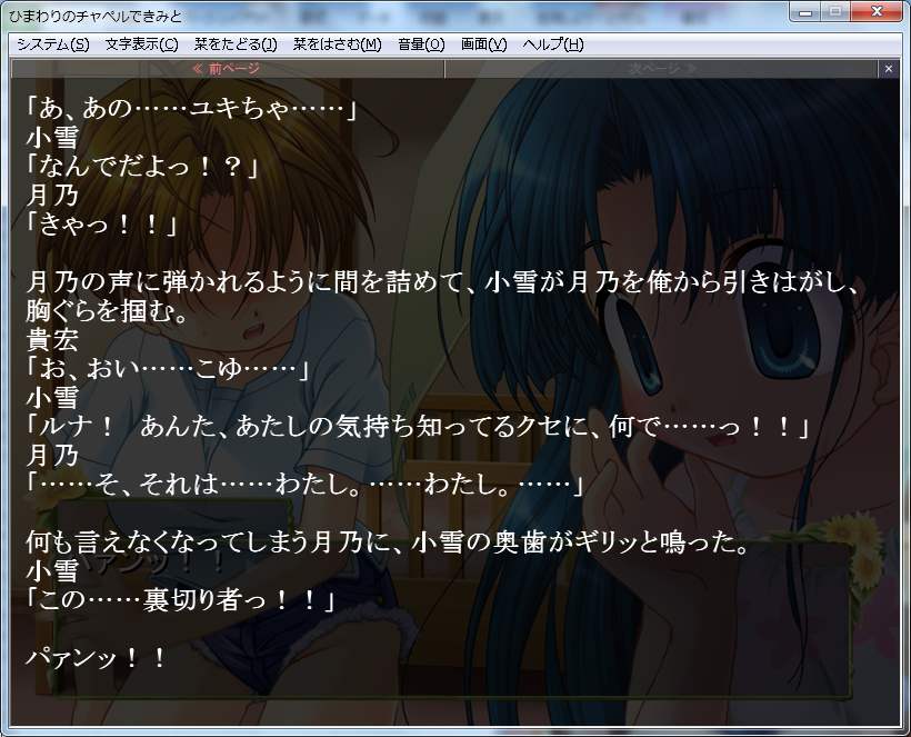 このゲームは結構ヒロインの嫉妬が見られます。主人公はモテモテというのもあり、結構女の子に好意を持たれています。そのうち左の月乃と右の小雪は幼馴染ということもあり幼いころから好意を持っています。